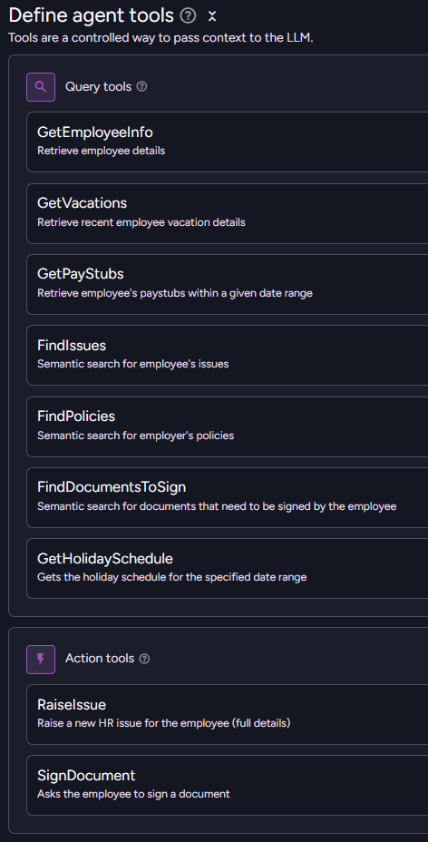 The agent is provided with a bunch of queries that it can call to find out various interesting details about the current employee. The end result is that the model will invoke those queries to get just the information it wants.