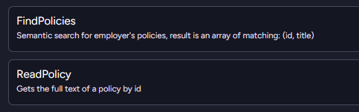 That works if you are a mom & pop shop, but what happens if you happen to be a big organization, with policies on everything from requesting time off to bringing your own device to modern slavery prohibition? Calling this tool is going to give all those policies to the model?