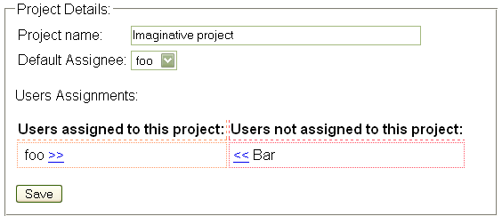 I am not a designer, and the HTML above has some hardocded values instead of using CSS, but I'm not doing this series to show you how to build pretty sites. :-) Do you see the >> and << signs near the users? This will allow us to simply move a user to or from the project.