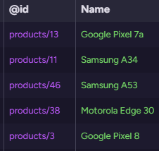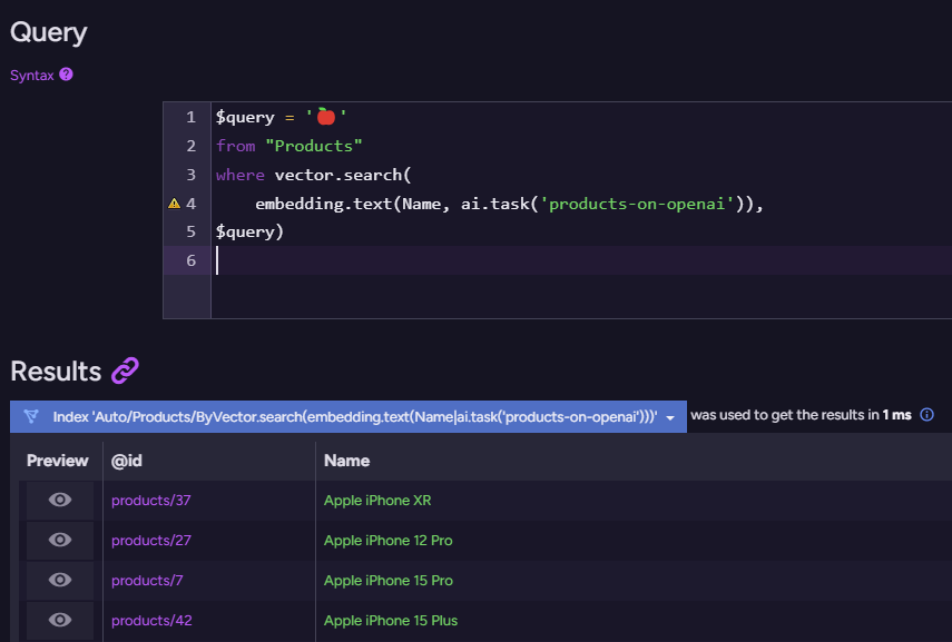 )I’m asking RavenDB to use the existing products-on-openai task on the Name field and the provided user input. And the results are: