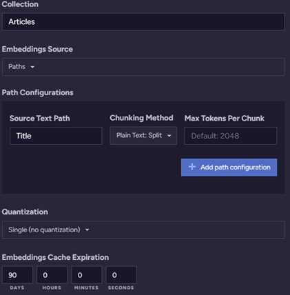 The screenshot shows how to create a task that generates embeddings from the Title field in the Articles collection.For a large text field, chunking options (including HTML stripping and markdown) allow splitting the text according to your configuration and generate multiple embeddings.RavenDB supports plain text, HTML, and markdown, covering the vast majority of text formats.You can simply point RavenDB at a field, and it will generate embeddings, or you can use a script to specify the data for embeddings generation.