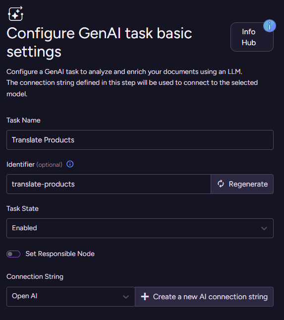 With the model selected, let’s get started. We need to go to AI Hub > AI Tasks > Add AI Task > Gen AI. This starts a wizard to guide you through the process of defining the task. The first thing to do is to name the task and select which connection string it will use. The real fun starts when you click Next.