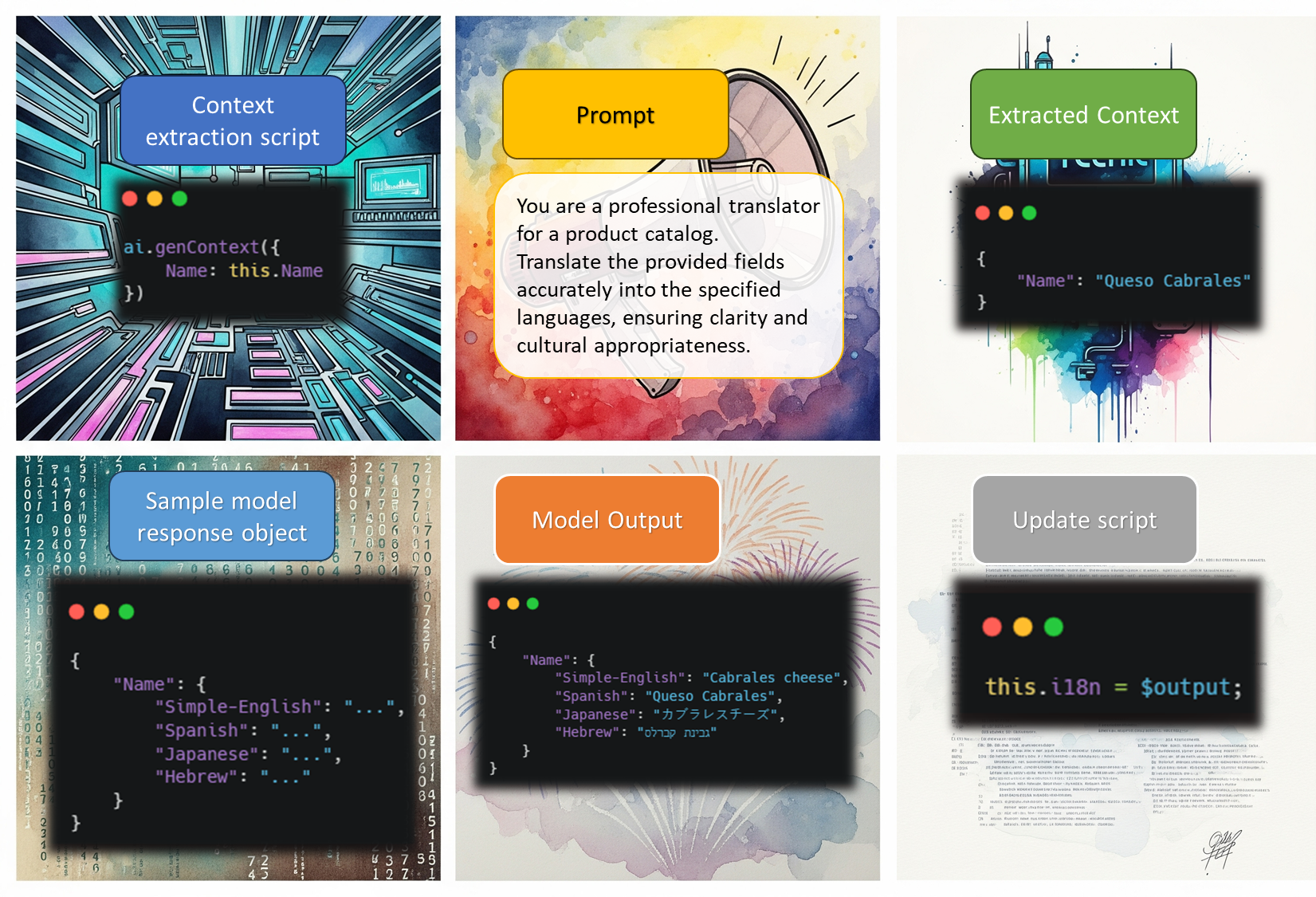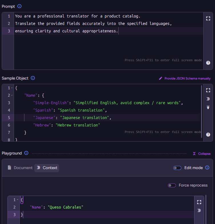 Note that in the prompt, we are not explicitly specifying which languages to translate to or which fields to process. We don’t need to - the fields the model will translate are provided in the context objects created by the "context generation script."
