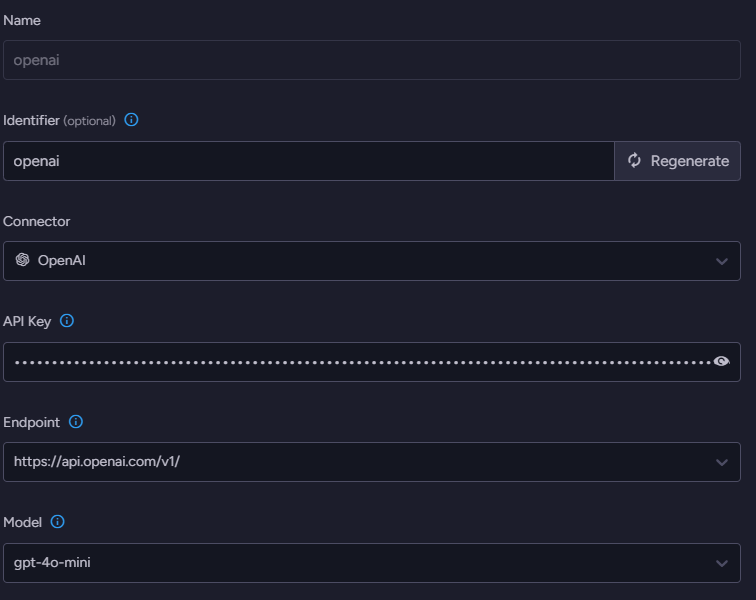 We’ll start the process by defining which model to use. Go to AI Hub > AI Connection Strings and define a new connection string. You need to name the connection string, select OpenAI as the connector, and provide your API key. The next stage is to select the endpoint and the model. I’m using gpt-4o-mini here because it is fast, cheap, and provides pretty good results.